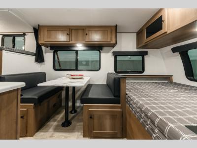 There's a comfortable place for everyone to sleep in this travel trailer with a front 54" x 80" bed and set of 30" x 74" bunk beds! The booth dinette can even transform into an extra-sleeping space when you're not using it to enjoy a meal prepared with the two-burner cooktop, microwave, and 8 cu. ft. 12V refrigerator. The rear corner bathroom has a tub/shower for you to start your mornings feeling clean and fresh, plus a medicine cabinet to keep your toiletries close. You will have plenty of room to store your outdoor gear between the front exterior pass-through storage area and the rear exterior storage area!