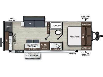 Sleeps 3 Slides 1 Length 26 ft Ext Width 7 ft 6 in Ext Height 10 ft 2 in Hitch Weight 570 lbs GVWR 6000 lbs Dry Weight 4562 lbs Cargo Capacity 1438 lbs Fresh Water Capacity 52 gals Grey Water Capacity 70 gals Black Water Capacity 35 gals Available Beds Queen Refrigerator Type 12V Refrigerator Size 10 cu ft Cooktop Burners 2 Number of Awnings 1 LP Tank Capacity 20 lbs Water Heater Type On Demand Tankless AC BTU 15000 btu Awning Info Power w/LED Lights Axle Count 2 Number of LP Tanks 2 Shower Type Standard Electrical Service 55 amp Solar Wattage 400 watts Similar Travel Trailer Floorplans