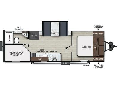 Sleeps 7 Slides 1 Length 27 ft 8 in Ext Width 7 ft 6 in Ext Height 10 ft 2 in Hitch Weight 536 lbs GVWR 6000 lbs Dry Weight 4632 lbs Cargo Capacity 1368 lbs Fresh Water Capacity 52 gals Grey Water Capacity 35 gals Black Water Capacity 35 gals Number Of Bunks 2 Available Beds Queen Refrigerator Type 12V Refrigerator Size 10 cu ft Cooktop Burners 2 Number of Awnings 1 LP Tank Capacity 20 lbs Water Heater Type On Demand Tankless AC BTU 15000 btu Awning Info Power w/LED Lights Axle Count 2 Number of LP Tanks 2 Shower Type Standard Electrical Service 55 amp Solar Wattage 400 watts Similar Travel Trailer Floorplans