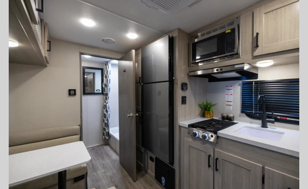 Sleeps 7 Slides 1 Length 23 ft 1 in Ext Width 7 ft 6 in Ext Height 10 ft 1 in Int Height 6 ft 6 in Hitch Weight 590 lbs GVWR 5690 lbs Dry Weight 4324 lbs Cargo Capacity 1366 lbs Fresh Water Capacity 44 gals Grey Water Capacity 30 gals Black Water Capacity 30 gals Furnace BTU 19000 btu Number Of Bunks 2 Available Beds Murphy Refrigerator Type GE 12V Refrigerator Size 10.7 cu ft Cooktop Burners 2 Number of Awnings 1 LP Tank Capacity 20 lbs Water Heater Type Tankless On Demand AC BTU 13500 btu Awning Info 15' Electric with Multicolored LED Light Strip Axle Count 1 Number of LP Tanks 1 Shower Type Tub/Shower Combo Electrical Service 30 amp Similar Floorplans