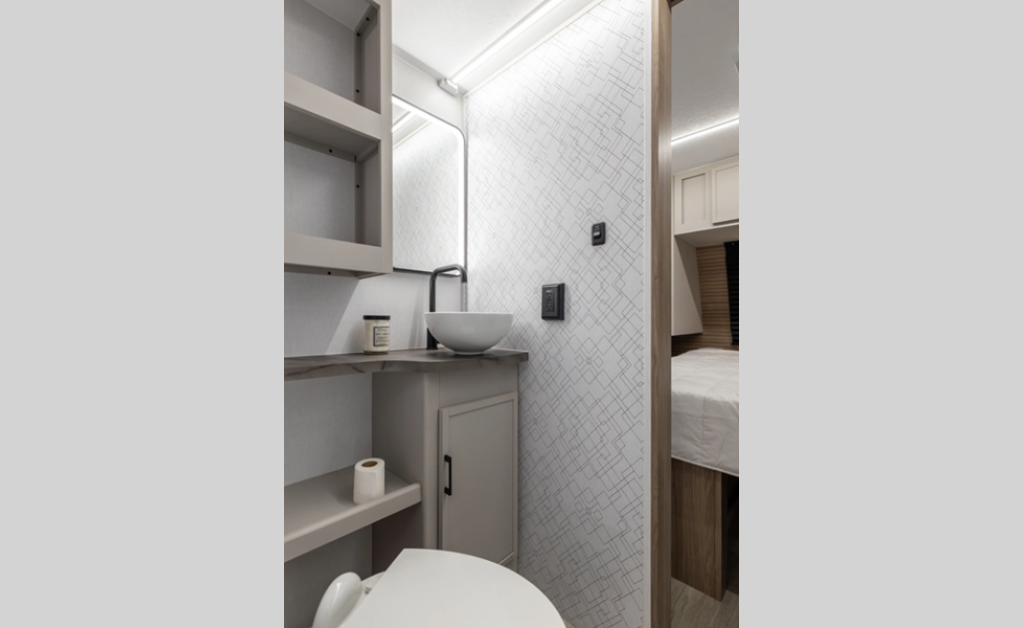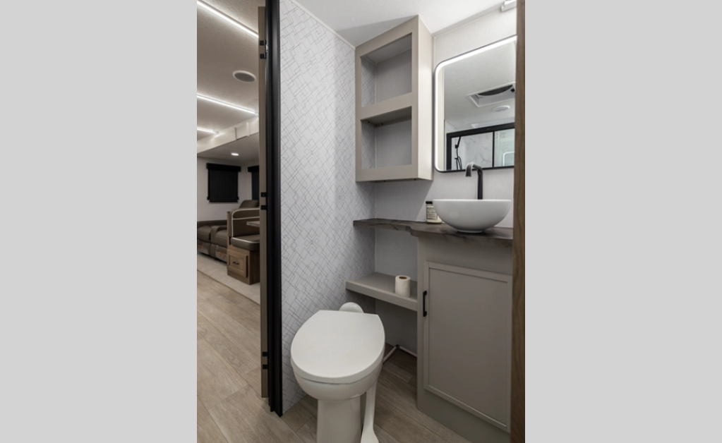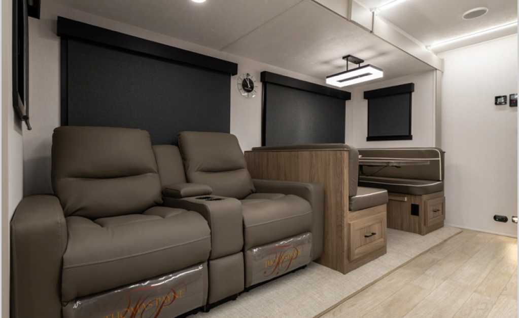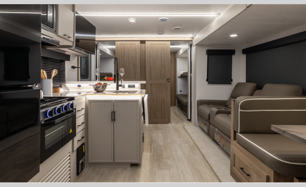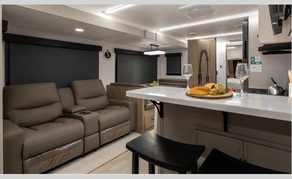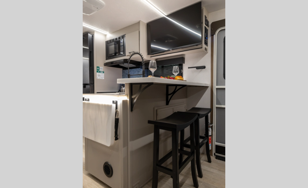 This stunning new brand of travel trailer is designed with premium features and innovative design elements that will make your journeys unforgettable. The Liberty Edition boasts impressive interior space, with a cleverly designed layout and thoughtful touches that make it feel like a home away from home. Flip-up countertop extensions provide extra space for meal prep or work.