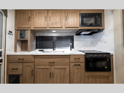 Check out this rear kitchen travel trailer that can sleep three to four each night. The front master bedroom includes a queen bed with vaulted under-bed storage for your belongings and dual wardrobes for even more storage. The theater seating within the large slide out and the booth dinette will provide comfortable seating space, and there is a Smart TV for those rainy camp days. This model also includes a three burner cooktop, a microwave oven, and an 10 cu. ft. double door refrigerator for your perishables. And don't forget about the power awning with LED lights!