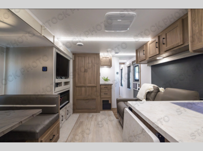 Are you looking for a travel trailer that will feel more like home? Look no further than this model that features a private bedroom up front, a full bath, plus a spacious rear kitchen. You will love to relax on the sofa or opt for the theatre sofa/hide-a-bed sofa across from the Smart TV and fireplace, and there is a booth dinette for dining. This model also includes a hidden pantry behind the TV for smart storage solutions. If the weather is nice you may just want to sit outdoors under the 18' power awning with LED lights. The chef of your group can prepare a meal on the pull-out camp kitchen, and the kids can grab their scooters from the pass-through storage.
