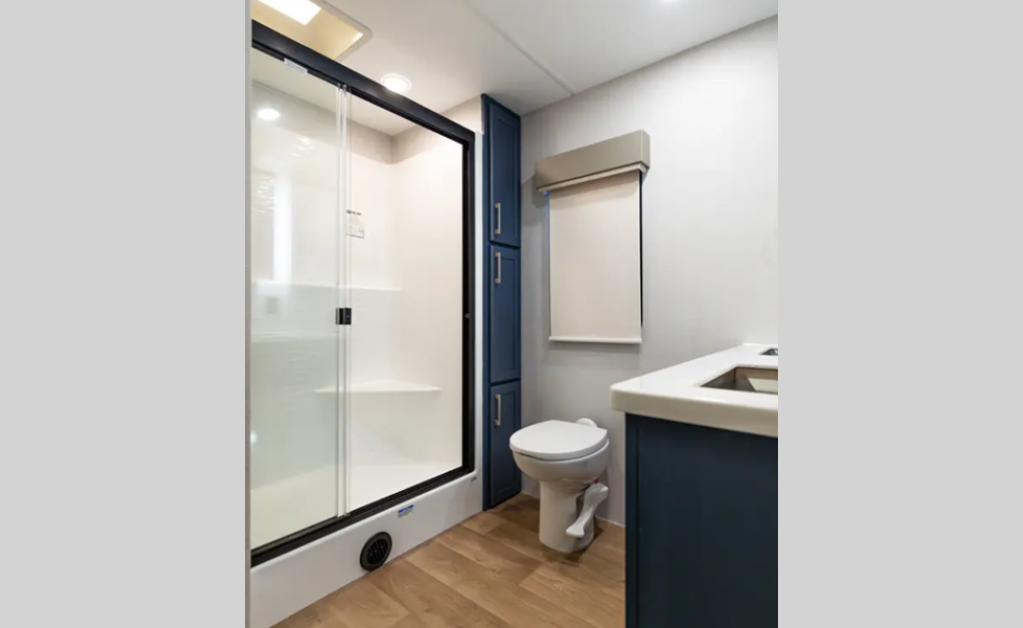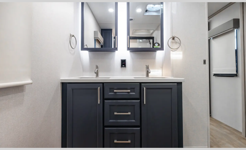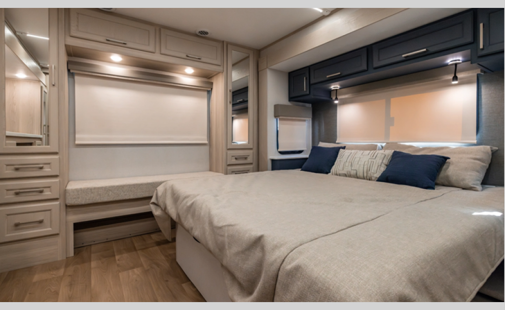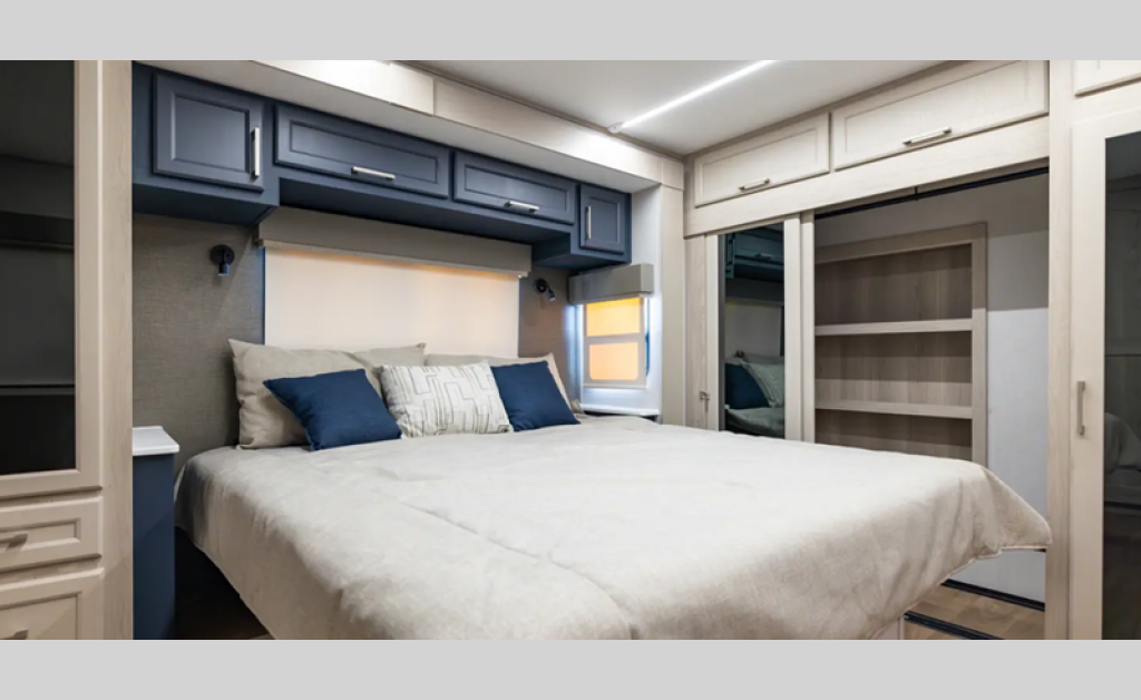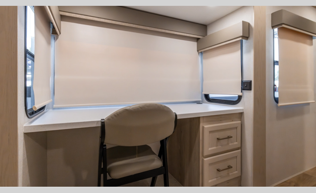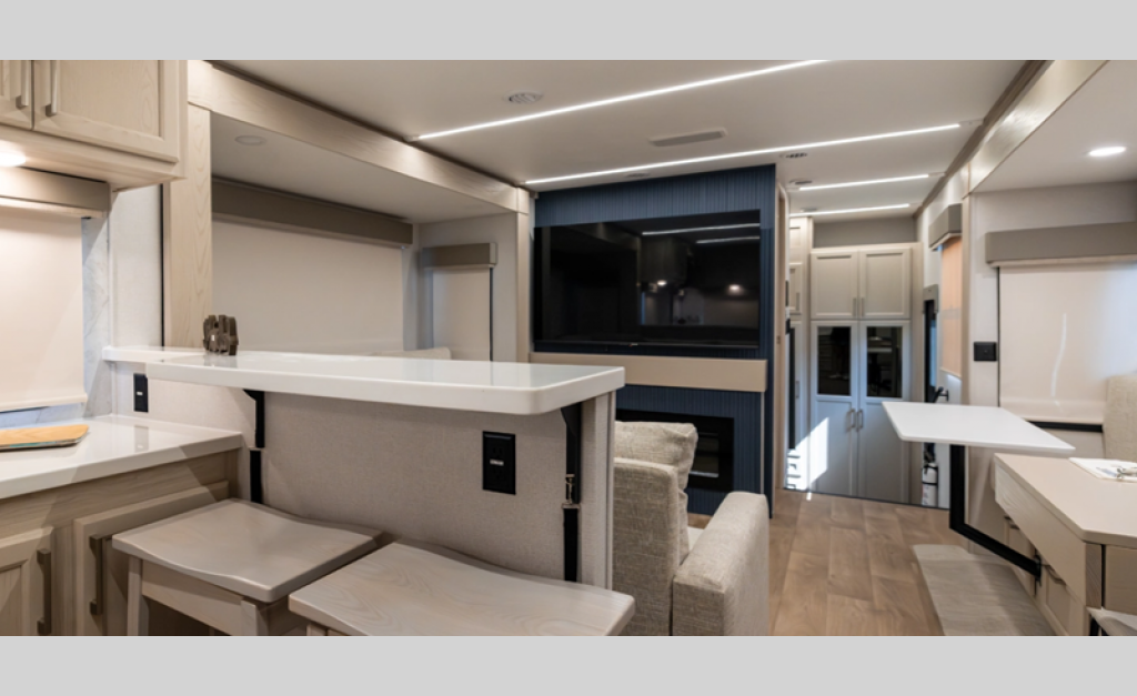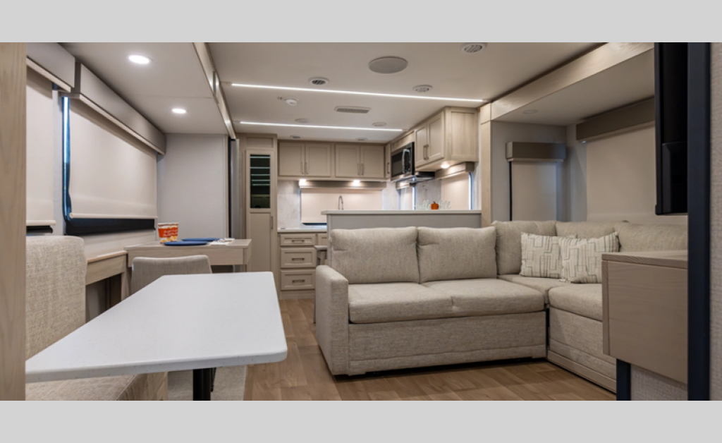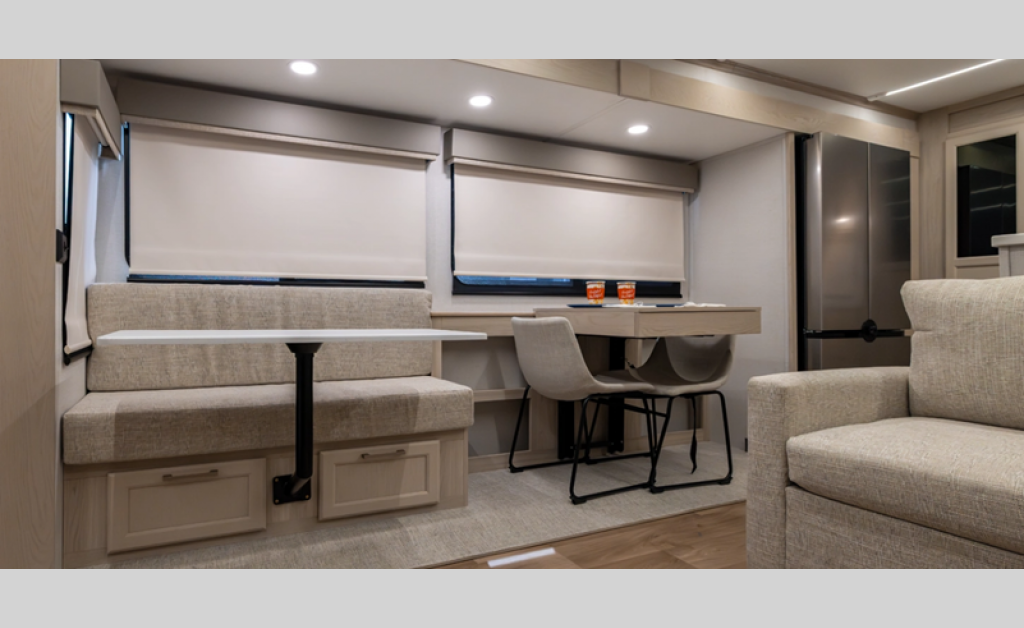 There is a 6-point hydraulic leveling system that will have you set up at camp in no-time, and the slam latches on all storage doors will make it easy to unload your gear. A heated utility convenience center is also found outside, along with a tire pressure monitoring system, a ladder, and slide toppers. Inside, you'll be met with upgraded true solid surface countertops in the bath and kitchen, dimmable ceiling strip lighting, hybrid marine-grade carpet, plus roller day/night shades in the main areas to name a few comforts.