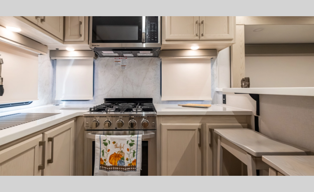 - Stainless Steel Appliance Pkg including 18 cu ft. 12V Refer, 1.7 Cu Ft Microwave and Residential Style 24" Range