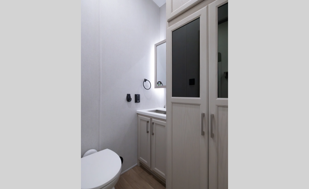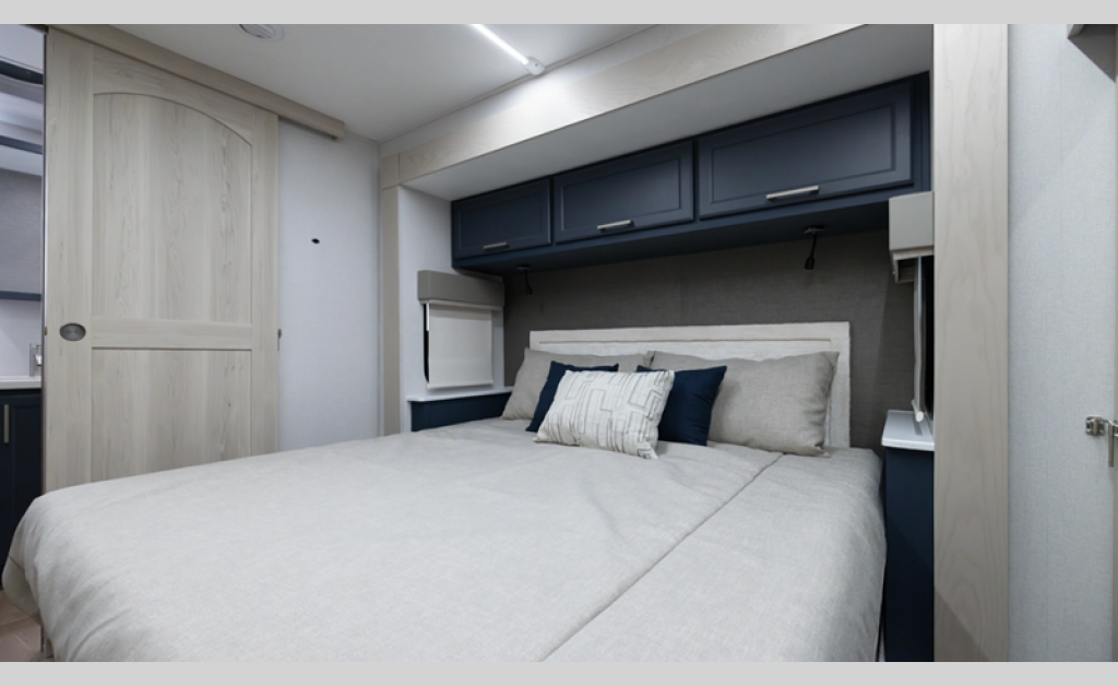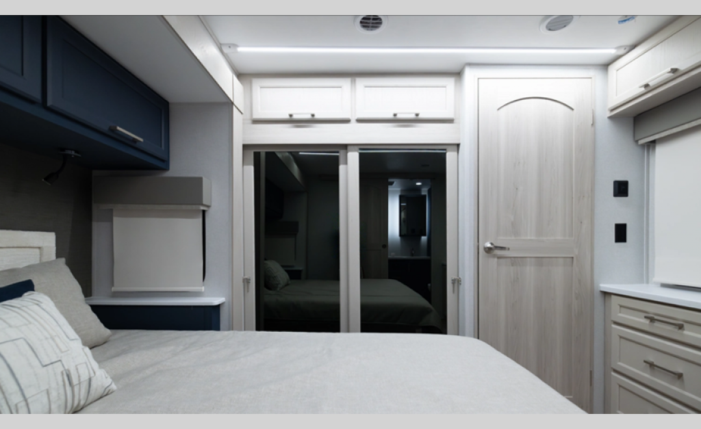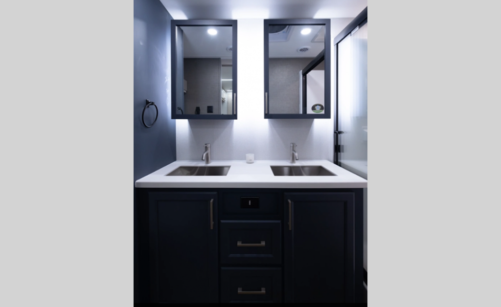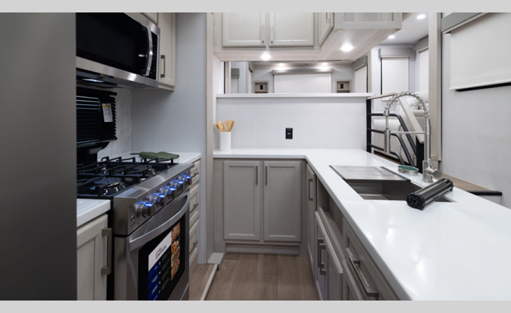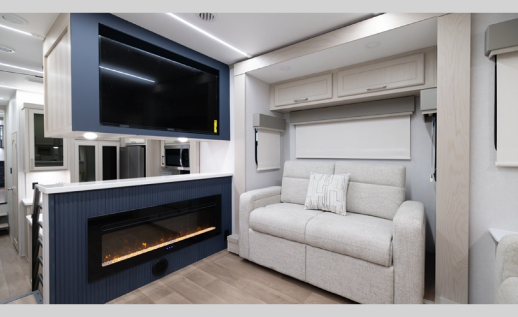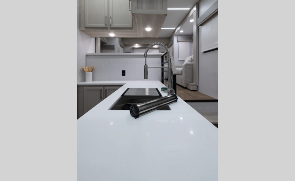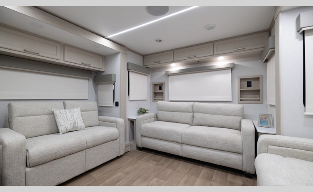Setting up is simple with the standard 6-point hydraulic leveling system, getting you settled in no time, and the slam latches on all storage doors paired with magnetic compartment holds make accessing your gear effortless. Outside, you'll also find a heated utility convenience center, 12V heat pads on all holding tanks for extended season camping, plus power awnings with LED lights. Inside, you are greeted with upgraded true solid surface countertops in both the kitchen and bath, soft close hidden-hinge reinforced doors and drawers with upgraded hardware, and dimmable ceiling strip lighting with three independent zones to set the perfect mood.