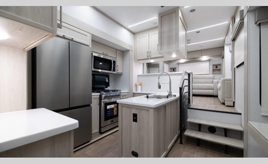 Sleeps 4 Slides 3 Length 41 ft 5 in Ext Width 8 ft 5 in Ext Height 13 ft 6 in Hitch Weight 2635 lbs GVWR 16635 lbs Dry Weight 13609 lbs Cargo Capacity 3026 lbs Fresh Water Capacity 75 gals Grey Water Capacity 78 gals Black Water Capacity 71 gals Tire Size 16" Furnace BTU 35000 btu Available Beds King Refrigerator Type 12V Stainless Steel Residential w/Ice Maker Shower Size 48" x 30" Number of Awnings 2 Axle Weight 7000 lbs LP Tank Capacity 30 lbs Water Heater Capacity 12 gal Water Heater Type Quick Recovery AC BTU 45000 btu TV Info LR 50" Smart TV, BR Smart TV Awning Info 11' and 19' Power with LED Lights Axle Count 2 Washer/Dryer Available Yes Number of LP Tanks 2 Shower Type Shower w/Seat Electrical Service 50 amp Similar Floorplans