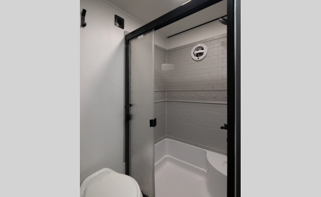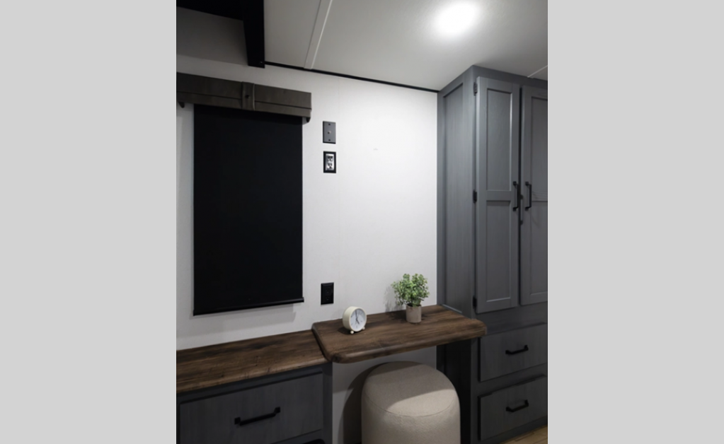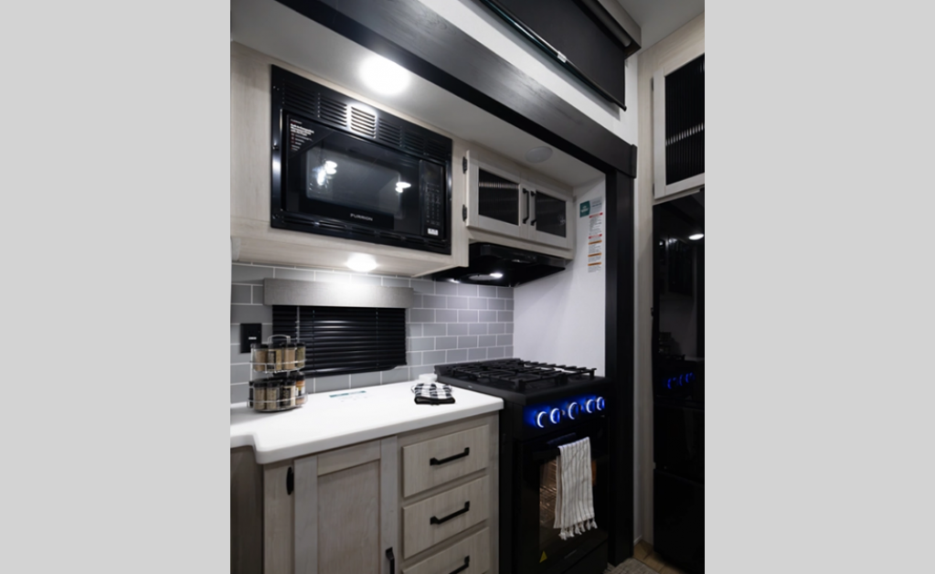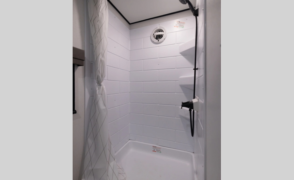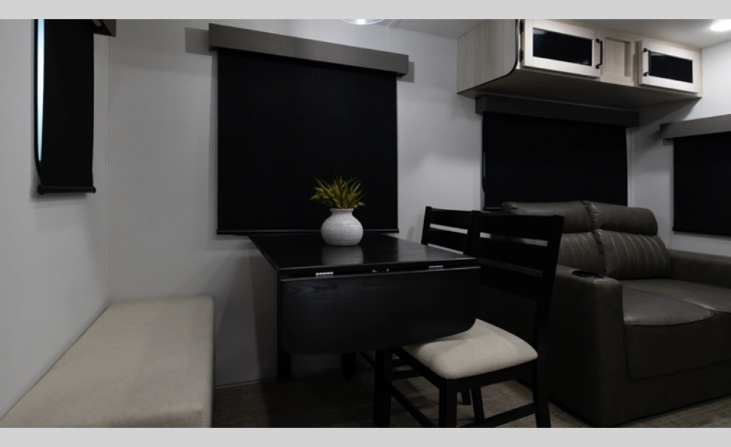 The Congoleum flooring inside is not only eye-catching, but also resilient and durable to withstand your adventurous lifestyle. There is a tankless water heater for added comfort, along with night roller shades, a residential-style refrigerator, and solid surface countertops.
