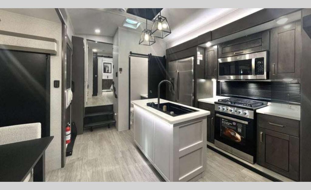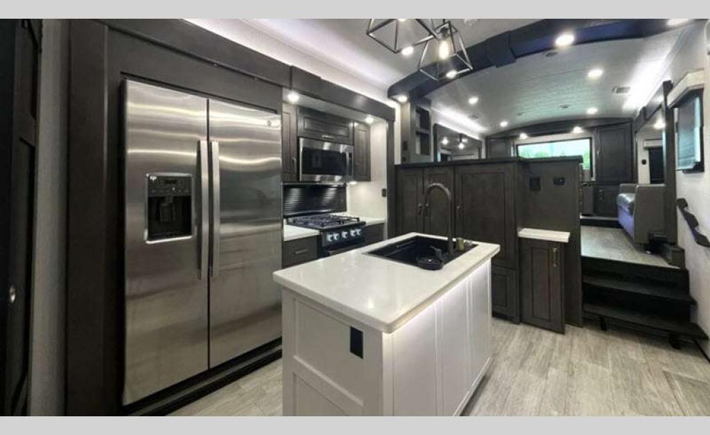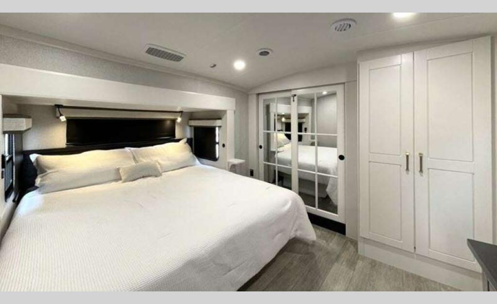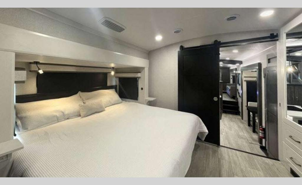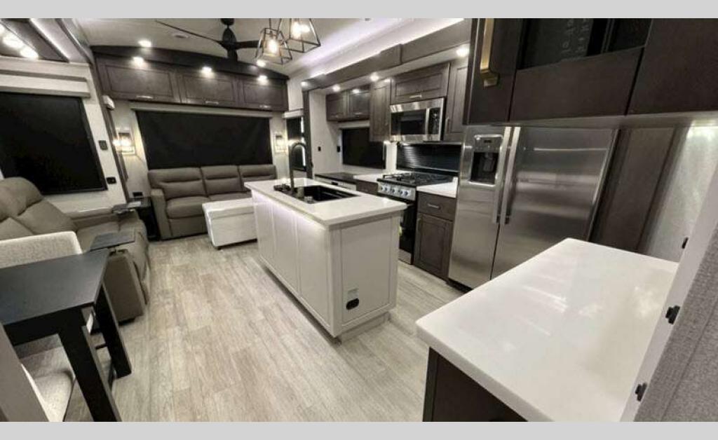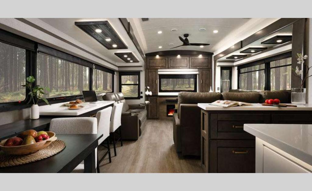 Sleeps 4 Slides 5 Length 43 ft 11 in Ext Width 8 ft 6 in Ext Height 13 ft 3 in Int Height 8 ft 6 in Interior Color Stonewall Gray Exterior Color Opt. Full Body Paint (Ash, Shadow, Glacier Blue) Hitch Weight 3090 lbs GVWR 17995 lbs Dry Weight 15645 lbs Cargo Capacity 2350 lbs Fresh Water Capacity 75 gals Grey Water Capacity 74 gals Black Water Capacity 74 gals Tire Size 215/75R17.5H Furnace BTU 40000 btu Available Beds King Refrigerator Type Residential Refrigerator Size 21 cu ft Convection Cooking Yes Cooktop Burners 4 Shower Size 36" x 48" Number of Awnings 2 Axle Weight 8000 lbs LP Tank Capacity 90 Lbs. Water Heater Type On Demand Tankless AC BTU 30000 btu TV Info LR 4K Smart LED HDTV, BR 32" 4K Smart TV Awning Info 14' & 14' Electric w/ Integrated RGB LED Lights Axle Count 2 Washer/Dryer Available Yes Shower Type Shower w/Seat Solar Wattage 400 watts Similar Floorplans