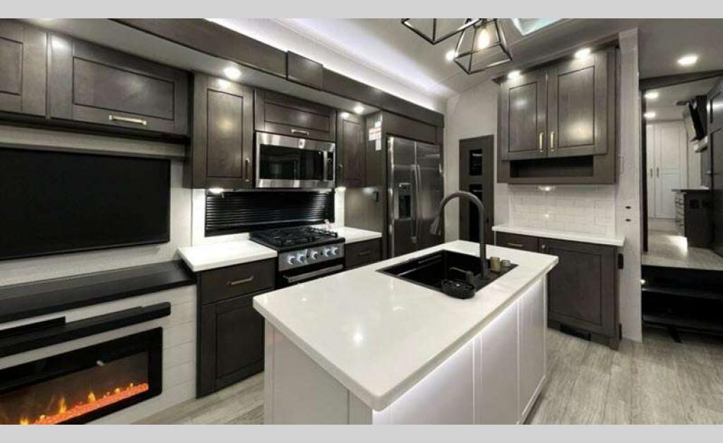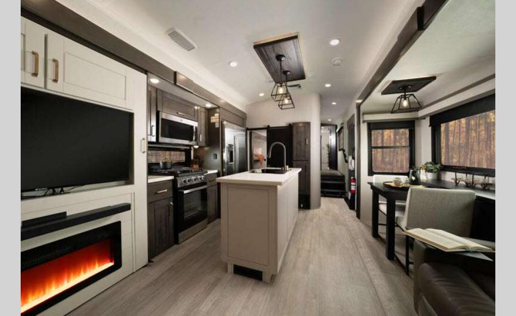 Sleeps 4 Slides 3 Length 40 ft 5 in Ext Width 8 ft 6 in Ext Height 13 ft 3 in Int Height 8 ft 4 in Interior Color Stonewall Gray Exterior Color Opt. Full Body Paint (Ash, Shadow, Glacier Blue) Hitch Weight 2600 lbs GVWR 17300 lbs Dry Weight 14465 lbs Cargo Capacity 2835 lbs Fresh Water Capacity 75 gals Grey Water Capacity 82.5 gals Black Water Capacity 50 gals Tire Size 215/75R17.5H Furnace BTU 40000 btu Available Beds King Refrigerator Type Residential Refrigerator Size 21 cu ft Convection Cooking Yes Cooktop Burners 4 Shower Size 36" x 48" Number of Awnings 2 Axle Weight 8000 lbs LP Tank Capacity 90 Lbs. Water Heater Type On Demand Tankless AC BTU 30000 btu TV Info LR 4K Smart LED HDTV, BR 32" 4K Smart TV Awning Info 15' & 16' Electric w/ Integrated RGB LED Lights Axle Count 2 Washer/Dryer Available Yes Shower Type Walk-In Shower Solar Wattage 400 watts Similar Floorplans