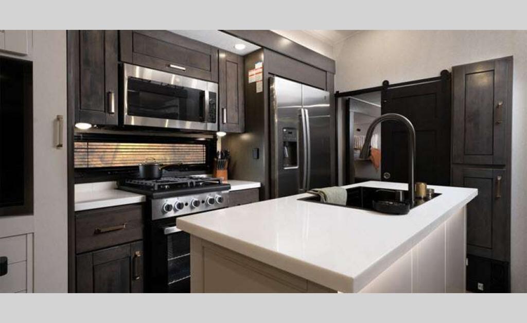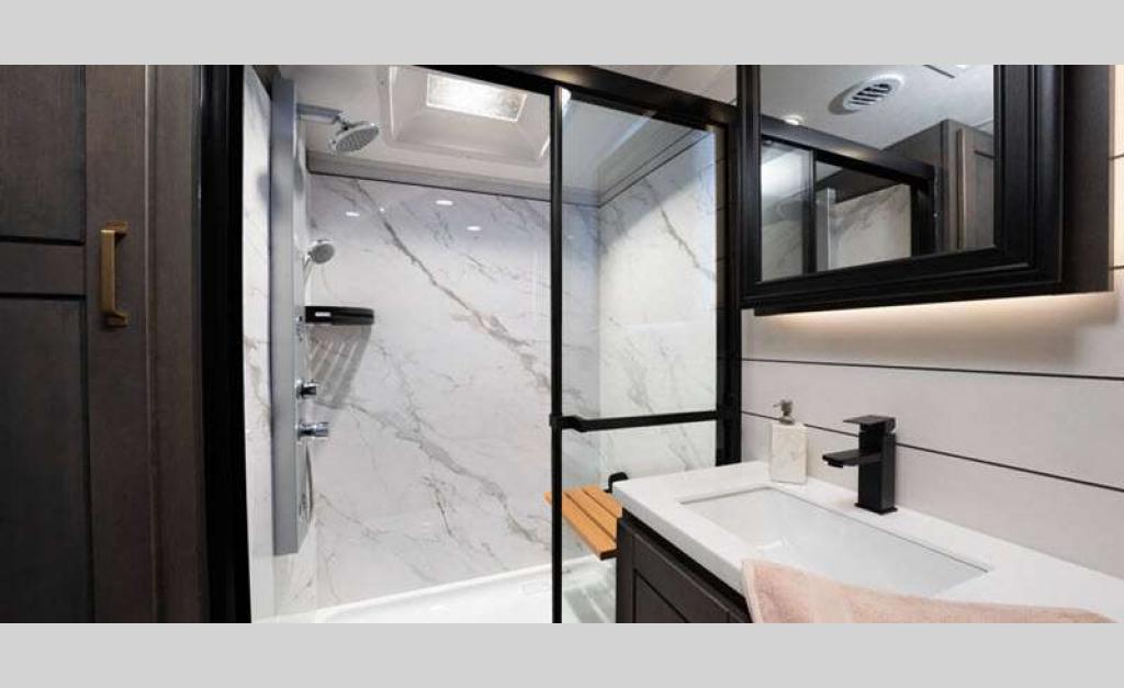 Sleeps 4 Slides 4 Length 42 ft 6 in Ext Width 8 ft 6 in Ext Height 13 ft 3 in Int Height 8 ft 6 in Interior Color Stonewall Gray Exterior Color Opt. Full Body Paint (Ash, Shadow, Glacier Blue) Hitch Weight 2970 lbs GVWR 17995 lbs Dry Weight 15275 lbs Cargo Capacity 2720 lbs Fresh Water Capacity 75 gals Grey Water Capacity 137 gals Black Water Capacity 50 gals Tire Size 215/75R17.5H Furnace BTU 40000 btu Available Beds King Refrigerator Type Residential Refrigerator Size 21 cu ft Convection Cooking Yes Cooktop Burners 4 Shower Size 36" x 48" Number of Awnings 2 Axle Weight 8000 lbs LP Tank Capacity 90 Lbs. Water Heater Type On Demand Tankless AC BTU 30000 btu TV Info LR 4K Smart LED HDTV, BR 32" 4K Smart TV Awning Info 15' & 17' Electric w/ Integrated RGB LED Lights Axle Count 2 Washer/Dryer Available Yes Shower Type Walk-In Shower Solar Wattage 400 watts Similar Floorplans