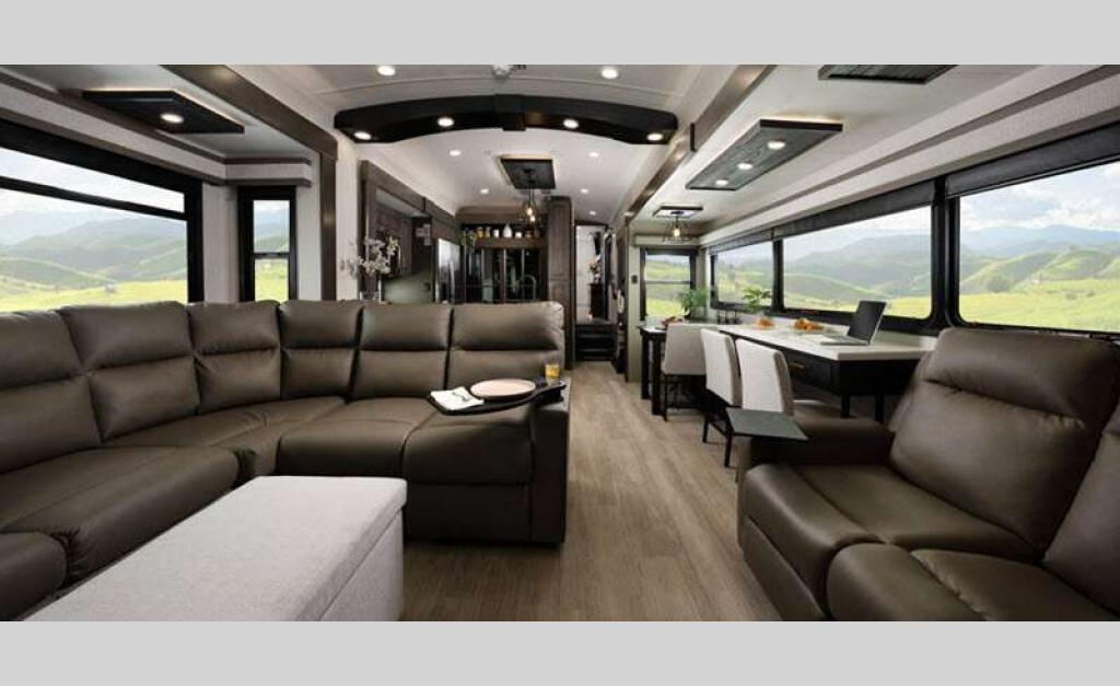 Sleeps 7 Slides 4 Length 43 ft 10 in Ext Width 8 ft 6 in Ext Height 13 ft 6 in Int Height 8 ft 7 in Interior Color Stonewall Gray Exterior Color Opt. Full Body Paint (Ash, Shadow, Glacier Blue) Hitch Weight 2925 lbs GVWR 18850 lbs Dry Weight 16110 lbs Cargo Capacity 2740 lbs Fresh Water Capacity 75 gals Grey Water Capacity 50 gals Black Water Capacity 100 gals Tire Size 215/75R17.5H Furnace BTU 40000 btu Available Beds King, Queen Refrigerator Type Residential Refrigerator Size 21 cu ft Convection Cooking Yes Cooktop Burners 4 Shower Size 36" x 48" Number of Awnings 2 Axle Weight 8000 lbs LP Tank Capacity 90 Lbs. Water Heater Type On Demand Tankless AC BTU 30000 btu TV Info LR 4K Smart LED HDTV, BR 32" 4K Smart TV Awning Info 10' & 16' Electric w/ Integrated RGB LED Lights Axle Count 2 Washer/Dryer Available Yes Shower Type Shower w/Seat Solar Wattage 400 watts Similar Floorplans