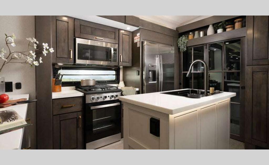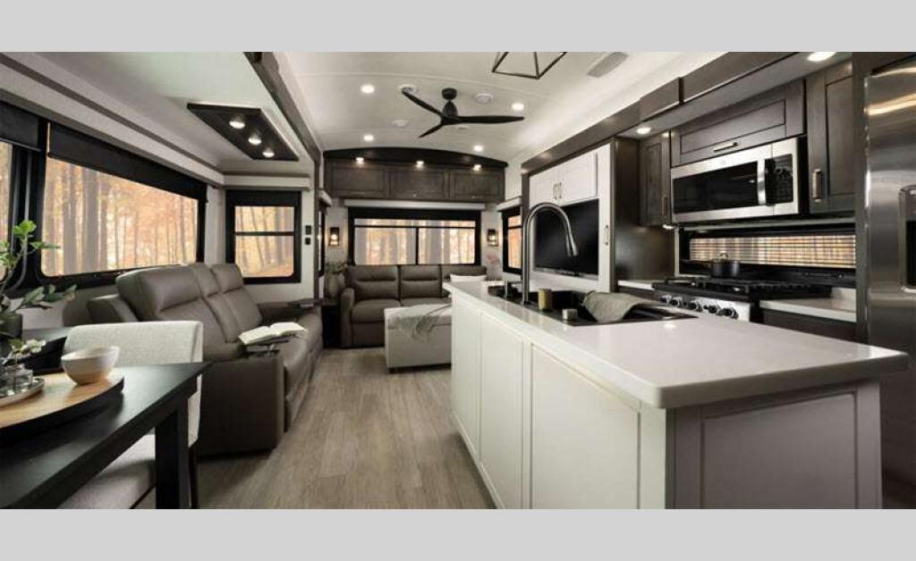 Sleeps 4 Slides 3 Length 36 ft 1 in Ext Width 8 ft 6 in Ext Height 13 ft 3 in Int Height 8 ft 6 in Interior Color Stonewall Gray Exterior Color Opt. Full Body Paint (Ash, Shadow, Glacier Blue) Hitch Weight 2405 lbs GVWR 16000 lbs Dry Weight 13060 lbs Cargo Capacity 2940 lbs Fresh Water Capacity 75 gals Grey Water Capacity 87 gals Black Water Capacity 50 gals Tire Size 215/75R17.5H Furnace BTU 40000 btu Available Beds King Refrigerator Type Residential Refrigerator Size 21 cu ft Convection Cooking Yes Cooktop Burners 4 Shower Size 36" x 48" Number of Awnings 2 Axle Weight 7000 lbs LP Tank Capacity 90 Lbs. Water Heater Type On Demand Tankless AC BTU 30000 btu TV Info LR 4K Smart LED HDTV, BR 32" 4K Smart TV Awning Info 10' & 16' Electric w/ Integrated RGB LED Lights Axle Count 2 Washer/Dryer Available Yes Shower Type Walk-In Shower Solar Wattage 400 watts Similar Floorplans