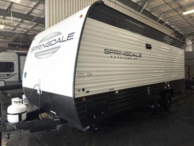With any Springdale Classic Mini travel trailer by Keystone, you will enjoy lightweight towing thanks to their single-axle! You'll find the XL entry assist handle will make entering and exiting your unit easier than ever, and the power awning will provide protection from the sun as you relax in your camp chairs outside. Each model includes blackout night shades, solid wood cabinet doors and drawers, a shower skylight for more standing room, plus many more interior comforts. There is also a 5,000 BTU sidewall A/C and 20K BTU furnace to keep you comfortable, plus a Girard tankless water heater for endless hot showers!
