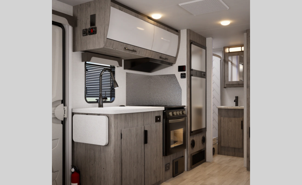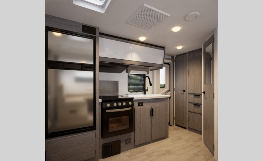 Each model is constructed with thermopane Euro windows, a molded fiberglass front cap, and Azdel interior panel walls for durability. There is Lite-Ply cabinet construction inside, along with Surf-X suedo solid surface lightweight countertops and tables, decorative backsplash, and many more interior comforts. Outside, the Keyed-Alike storage compartment doors will keep your gear secure and the exterior wash station will make it easy to wash off camp gear.
