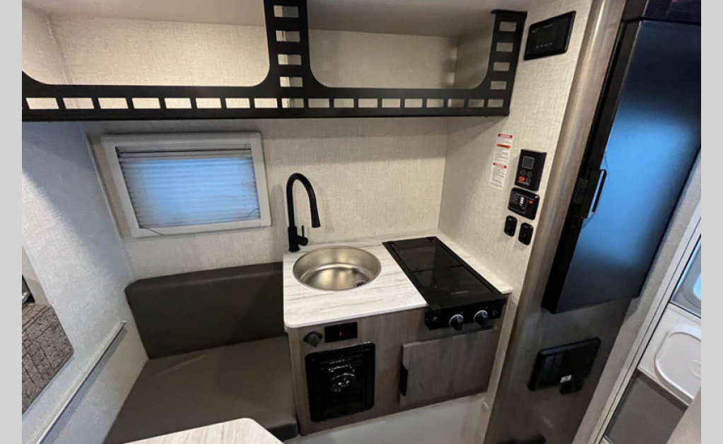Each camper features Azdel interior walls, a one-piece roof, and block foam insulation throughout to help extend your camping season. The overhead Molle panel storage space will let you pack essentials out of the way, and the 12V/USB charging ports will keep your electronics powered up. Outside, you'll find LED lights, a swing-out entry assist handle, Keyed-Alike doors, and an exterior wash station to wash off hiking gear.
