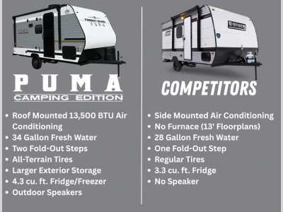 The Puma Camping Edition by Palomino offer an affordable travel trailer for rookie campers or seasoned RVers! They are built with 5/8" tongue and groove plywood flooring and a front diamond plate for added protection. There are also exterior clamp style door latches, back up camera prep, and 20 lb. LP bottles. Head inside to find Thermofoil countertops with a smooth drop edge, bedroom USB ports and outlets, and a GE appliance and kitchen package.