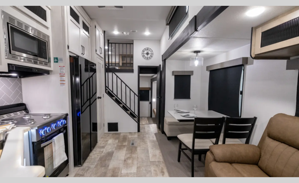 Sleeps 8 Length 35 ft 11 in Ext Width 8 ft 6 in Ext Height 13 ft 5 in Hitch Weight 1135 lbs GVWR 10623 lbs Dry Weight 8823 lbs Cargo Capacity 1800 lbs Fresh Water Capacity 43 gals Grey Water Capacity 70 gals Black Water Capacity 35 gals Available Beds King Refrigerator Type Residential Cooktop Burners 4 Shower Size 34" x 40" Number of Awnings 1 LP Tank Capacity 30 lbs Water Heater Type Tankless TV Info LR 50" TV Awning Info 17' Washer/Dryer Available Yes Number of LP Tanks 2 Shower Type Standard Electrical Service 50 amp Similar Floorplans
