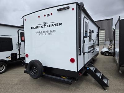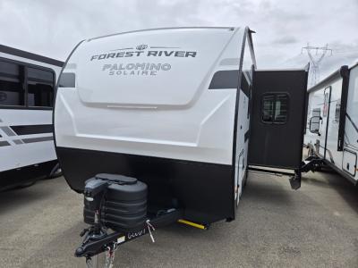 Each SolAire travel trailer by Palomino features a white gel coat exterior and an aluminum superstructure frame for lightweight towing. You will love having a power tongue jack for easy set up, plus slam latch baggage doors with magnets to make unloading easier than ever. There is also a power awning with LED lights and aluminum wheels included on the exterior. Each SolAire is constructed to last with Azdel composite, a fully laminated rear wall and roof, plus a fully enclosed and heated underbelly. The interior includes roller shades and kitchen backsplash, USB ports to keep your electronics charged, a Bluetooth stereo with speakers, and many more stand-out features!