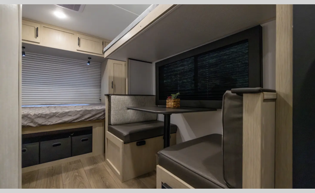 Sleeps 4 Length 16 ft 9 in Ext Width 8 ft Ext Height 10 ft 6 in Hitch Weight 318 lbs GVWR 4318 lbs Dry Weight 3115 lbs Cargo Capacity 1203 lbs Fresh Water Capacity 39 gals Grey Water Capacity 30 gals Black Water Capacity 30 gals Number Of Bunks 1 Available Beds Queen Refrigerator Type Residential Style Refrigerator Size 8 cu ft Cooktop Burners 2 LP Tank Capacity 20 lbs Water Heater Type Tankless AC BTU 8000 btu Axle Count 1 Number of LP Tanks 1 Shower Type Standard Similar Floorplans