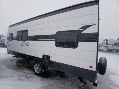 Sleeps 7 Length 22 ft 11 in Ext Width 8 ft Ext Height 10 ft 6 in Hitch Weight 529 lbs GVWR 4829 lbs Dry Weight 3778 lbs Cargo Capacity 1051 lbs Fresh Water Capacity 39 gals Grey Water Capacity 30 gals Black Water Capacity 30 gals Number Of Bunks 2 Available Beds Queen Refrigerator Type Residential Style Refrigerator Size 8 cu ft Cooktop Burners 2 LP Tank Capacity 20 lbs Water Heater Type Tankless AC BTU 8000 btu Axle Count 1 Number of LP Tanks 1 Shower Type Tub/Shower Combo Similar Travel Trailer Floorplans