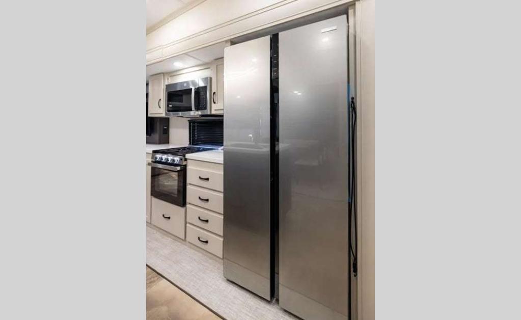 Sleeps 4 Slides 3 Length 42 ft 4 in Ext Width 8 ft Ext Height 13 ft Interior Color Shimmer, Slate Hitch Weight 2320 lbs GVWR 14500 lbs Dry Weight 12721 lbs Cargo Capacity 1779 lbs Fresh Water Capacity 48 gals Grey Water Capacity 135 gals Black Water Capacity 45 gals Tire Size 16" Available Beds King Refrigerator Type Side by Side Stainless Glass 12V Refrigerator Size 16 cu ft Cooktop Burners 3 Number of Awnings 1 Water Heater Type On Demand AC BTU 27000 btu TV Info LR 50" 4K Smart LED TV Awning Info 18' Electric w/LED Light Strip & One Hand Pitch Adjustment Axle Count 2 Washer/Dryer Available Yes Shower Type Shower w/Seat Electrical Service 50 amp Similar Floorplans