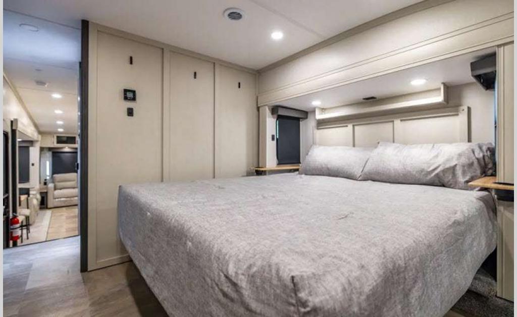 Sleeps 8 Slides 3 Length 42 ft 6 in Ext Width 8 ft Ext Height 13 ft Interior Color Shimmer, Slate Hitch Weight 2040 lbs GVWR 14500 lbs Dry Weight 12185 lbs Cargo Capacity 2315 lbs Fresh Water Capacity 48 gals Grey Water Capacity 112 gals Black Water Capacity 75 gals Tire Size 16" Available Beds Queen, King Refrigerator Type Side by Side Stainless Glass 12V Refrigerator Size 16 cu ft Cooktop Burners 3 Number of Awnings 1 Water Heater Type On Demand AC BTU 27000 btu TV Info LR 50" 4K Smart LED TV Awning Info 24' Electric w/LED Light Strip & One Hand Pitch Adjustment Axle Count 2 Shower Type Shower w/Seat Electrical Service 50 amp Similar Floorplans