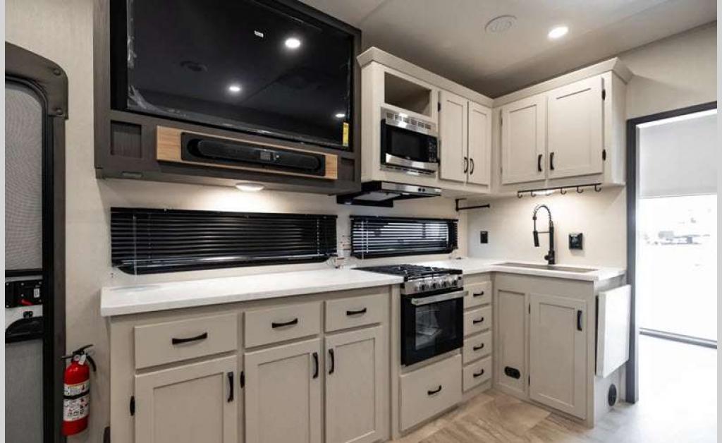 Sleeps 4 Slides 2 Interior Color Shimmer, Slate Available Beds Queen Refrigerator Type GE Stainless 12V Refrigerator Size 10 cu ft Cooktop Burners 3 Shower Size 34" x 34" Number of Awnings 1 Water Heater Type On Demand AC BTU 13500 btu TV Info LR 50" 4K Smart LED TV Awning Info 20' Electric w/LED Light Strip & One Hand Pitch Adjustment Axle Count 2 Shower Type Radius Electrical Service 50 amp Similar Floorplans
