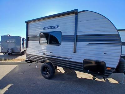 You can trust the build and enjoy your experience with any one of these Sunset Park RV Sun Lite travel trailers! Their aerodynamic profile is not only easy to haul, but also saves on fuel. They are built to withstand years of traveling even though they are lightweight with a diamond plate rock guard, a one piece PVC roof membrane, Dexter Spring-Leaf axles, and tinted safety glass windows. Some comfort standards you are sure to enjoy are the two-burner stove top range with hood, light and fan, plus the refrigerator and microwave, and an outside shower to help keep the dirt outdoors where it belongs.