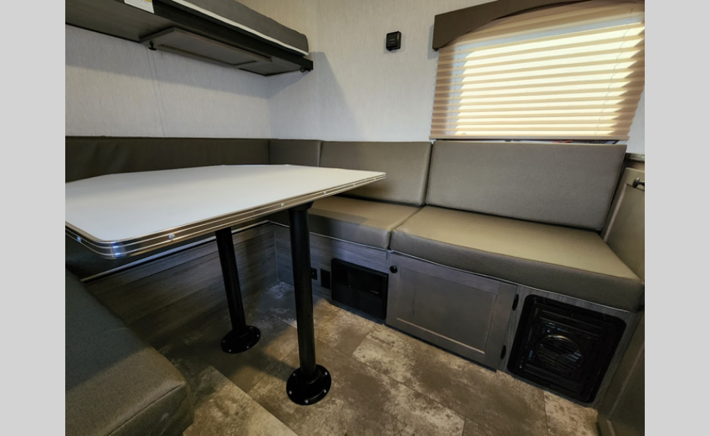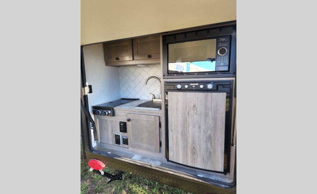 If you aren't already convinced to check out the Sunray, then the features will do the trick. The construction consists of a fully walkable 3/8" roof decking, wood studs built 16" on center, spring-leaf Dexter axles, and a powder-coated steel chassis. For comfort, you'll find an air conditioner and furnace, a 6-gallon DSI gas water heater, a stove, sink cover, a refrigerator, and microwave. You'll enjoy using the outside shower to rinse off muddy boots, sticky hands, or outdoor equipment, and the portable Bluetooth speaker will entertain you for years and years.